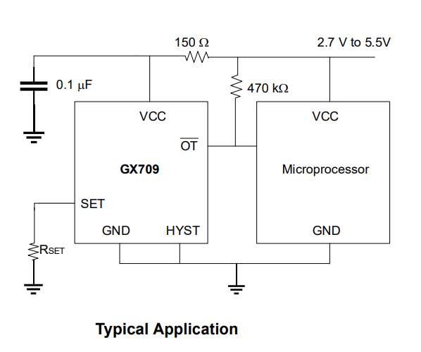 The GX709 is a fully-integrated, resistor-programmable temperature switch with a temperature threshold that is set by just one external resistor within the entire operating range. The TMP709 provides an open-drain, active-low output and has a 2.7V to 5.5V supply-voltage range.