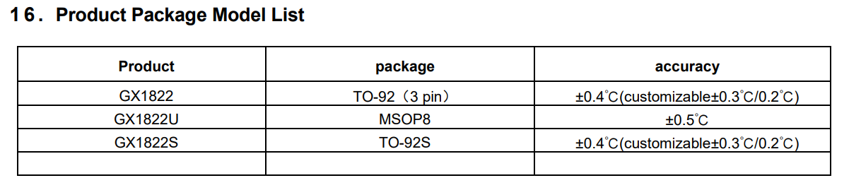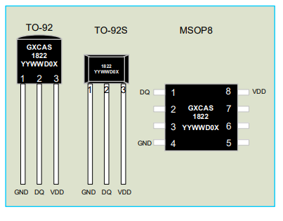 GX1822 digital thermometer provides temperature measurement with 9 to 12bit resolution, and can realize the lower limit and upper limit alarm of temperature through the programmable non-volatile memory unit. GX1822 uses a 1-wire bus protocol to communicate with the host computer, and only needs one signal line and one ground line. It has a temperature measurement range of -55°C to +125°C (-67°F to +257°F). The test accuracy in the range of -10°C~85°C can reach ±0.4°C. In addition, it can also work in parasitic mode, directly supplying power to the chip through the signal line, so that no additional power supply is required. Each GX1822 has an independent 64-bit serial number. Multiple GX1822s can be connected in series on the same 1-wire bus for networking. Only one processor can control multiple GX1822s distributed in a large area. This networking method is especially suitable for HVAC environment control, building, equipment, grain temperature measurement and industrial temperature measurement, process monitoring and control and other application fields.computer, consumeren, vironmental,industrial, and instrumentation applications.