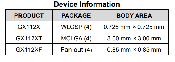 The GX112X is a digital temperature sensor with high-accuracy, low-power, and NTC/PTC thermistor replacements. It can be used for extended temperature measurement in communication, computer, consumer electronics, environmental, industrial and instrumentation applications. The GX112X provides ≤±0.5°C temperature accuracy with good temperature linearity over the normal operating range of -40°C to +125°C. The GX112X can provide extended temperature measurement mode, extending the temperature measurement range from -55°C to +150°C. The rated working voltage range of the GX112X is 1.4V~5.5V, and the maximum quiescent current in the entire working rage is 10µA (temperature measurement frequency 4Hz). The on-chip 12-bit ADC offers resolutions down to 0.0625°C. The GX112X adopts 4-Ball wafer level package of 0.725mm × 0.725mm, is compatible with SMBus and I2C interface, supports MDA commands, and allows up to 16 devices on one bus.