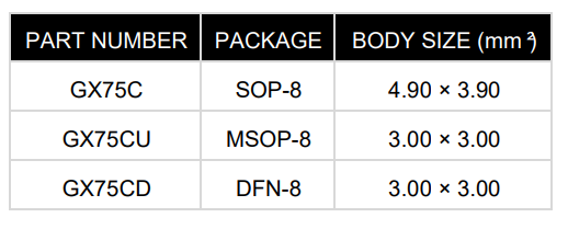 The GX75C is a fully integrated digital tempera-ture sensor with a 12-bit ADC that can operate at a 1.8-V suppy, and is pin and register compatible with the mainstream x75.