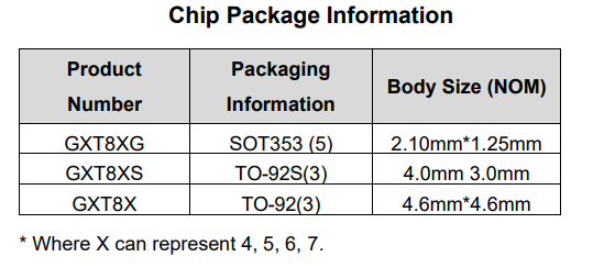 GXT84/85/86/87 (the GXT8X series only include these four models) feature low-output impedance, linear output, and factory calibration, enabling significant simplification of temperature control circuits and ADC requirements. This series of sensor components can operate with a single power supply ranging from 1.5V to 5.5V. The power supply current is below 10μA, and the self-heating effect is minimal, with a temperature change of less than 0.1°C in static air. GXT84/85/86/87 are available in low-cost 5-pin SOT353 surface mount, 3-pin TO-92 and 3-pin TO92S packages.