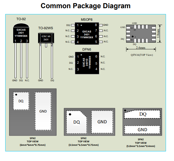 GX2431 is an EEPROM that communicates with the host using a standard single bus protocol and has a storage capacity of 1024 bits. Composed of four memory pages with 256 bits per page. The data is first written into an 8-byte register, verified to be correct, and then copied to EEPROM memory. Its characteristic is that the four memory pages are independent of each other and can be individually set to write protect or EPROM emulation mode. In EPROM storage mode, the state of all bits can only change from 1 to 0. GX2431 communicates through a 1-Wire bus. The communication adopts the standard 1-Wire protocol. Each device has a unique and unchangeable 64 bit ROM address code, which is written into the chip by factory lithography. In a multi-point 1-Wire network environment, this address code is used to address devices.