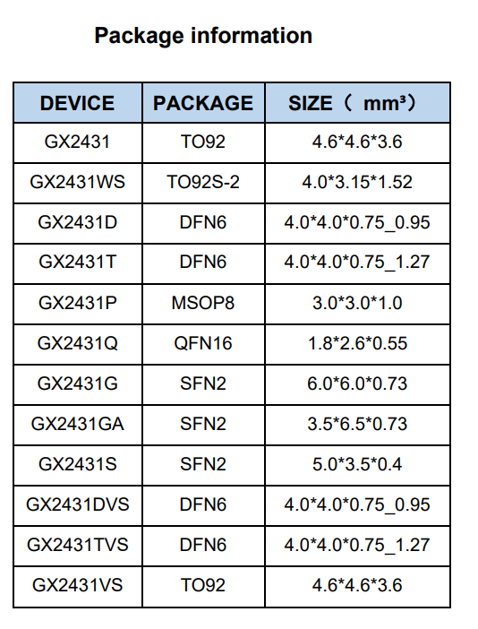 Standby current 0.75μA Package form TO92,TO92S-2,DFN6,DFN6L,MSOP8,QFN16,SFN2