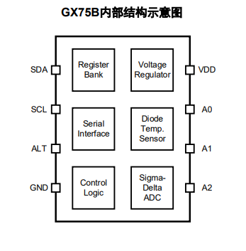 GX75B兼容SMBus和I2C接口,通信频率最高可达1MHz;在开启高速模式后,最高可达2.3MHz。GX75B具有三个地址输入引脚,在单个通信总线上最多可同时挂载8个器件。