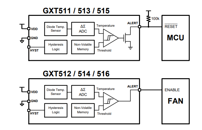 GXT51x支持+2℃、+5℃和+10℃这三种迟滞窗口,可通过HYST引脚的电气连接来选择.