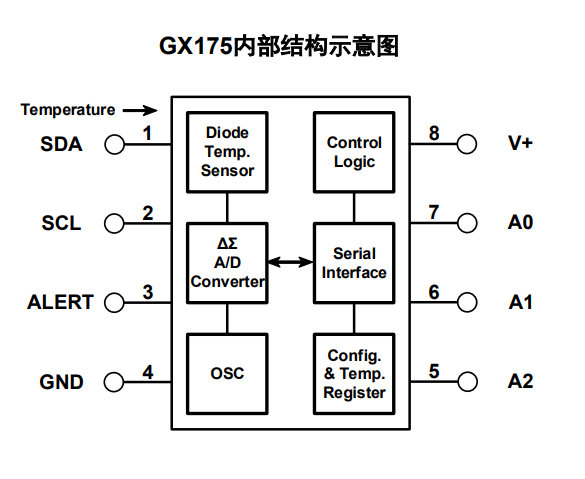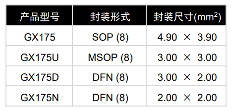 GX175采用8-Pin SOP / MSOP / DFN封装,支持SMBus和I2C通信。在一条总线上最多可挂载27个不同地址的GX175芯片。GX175具有SMBus报警功能。