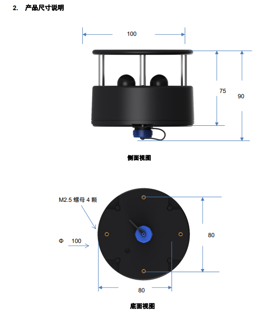 本品底部预埋 4 颗 M2.5 螺母,可用于本产品与外部支架固定。外部 M2.5 螺丝旋转进预埋螺母的长度建议不短于 4mm,不大于 5mm。各预埋螺母与中心距离为 40mm。