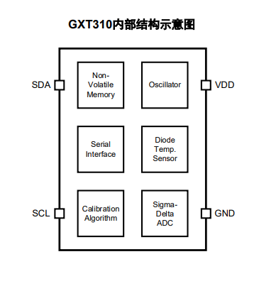 GXT310无需任何外部感温单元即可实现16位温度输出,并且在30℃~45℃温度范围内具有小于±0.1℃的测温误差。每颗芯片在出厂时均已完成精密校准,用户无需对温度输出进行任何额外补偿处理。