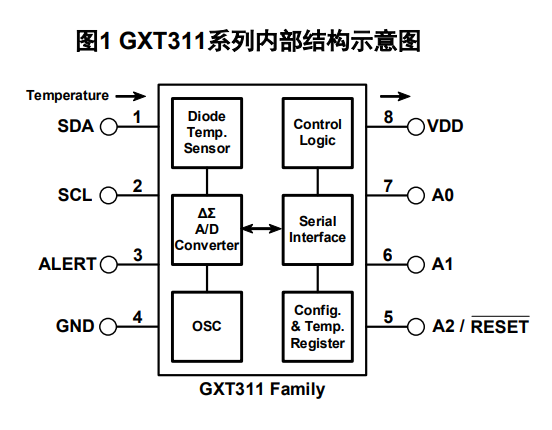 GXT311系列是一款高精度、低功耗的数字温度传感器,分为GXT311A、GXT311B两种型号,可用于通信、计算机、消费类电子、环境、工业和仪器仪表应用中的温度测量。GXT311H系列在-40℃至+125℃的正常工作范围内,可提供≤±0.3℃的测温精度;GXT311N