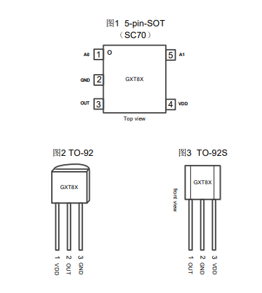 GXT84/85/86/87(后面GXT8X只这四款芯片)具有较低输出阻抗、线性输出、出厂校准,所以可极大简化温度控制电路和ADC的需求。该系列传感器件均可采用1.5 V至5.5 V的单电源供电。电源电流低于10μA,自热效应非常小,在静止空气中小于0.1°C。