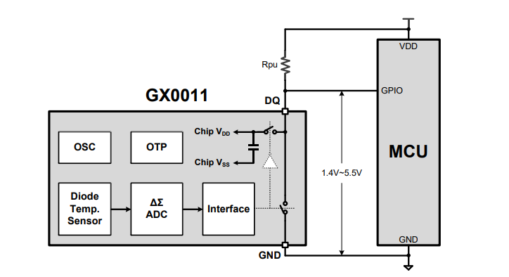 GX0011支持一线脉冲计数式通信,仅需单根信号线即可同时完成芯片供电和通信输出功能,从而有效降低MCU开销和成本。