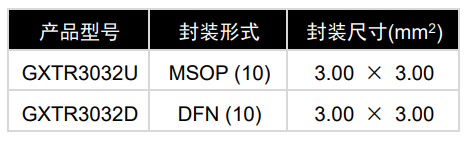 GXTR3032 本地通道和远程通道的测温精度典型值均为 ±1℃,并均提供 0.0625℃的测温分辨率和 -55℃ ~ +150℃的测温范围。GXTR3032 的电源电压范围为2.7V ~ 5.5V,并提供 3.0mm×3.0mm 的 10 Pin MSOP和 3mm×3mm 的 10 Pin DFN 装,以便集成到各种系统中。