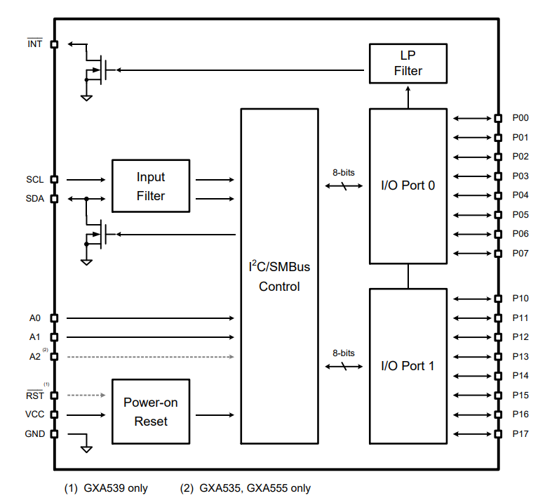 GXA535 系列用于扩展通用输入输出端口(GPIO)。端口数据通过标准两线 I2C 协议传输,最高可支持 1MHz通信速率(开启高速模式后最高可支持 2MHz)。