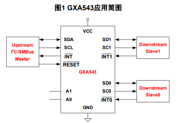 GXA543 是一款通过 I2C 总线控制的 2 通道双向数据传输开关芯片。上游主机通过芯片的 SCL、SDA引脚选通某个或某多个下游从机,并进行指定的数据传输。GXA543 支持选通任意组合的下游通道从机。