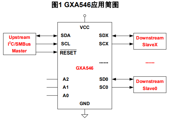 GXA546 提供低有效复位引脚RESET 。若下游某个从机的 I2C 总线出现锁死情况,可将RESET 引脚拉低对 GXA546 进行复位,从而不再选通该下游从机,释放锁死的 I2C 总线。