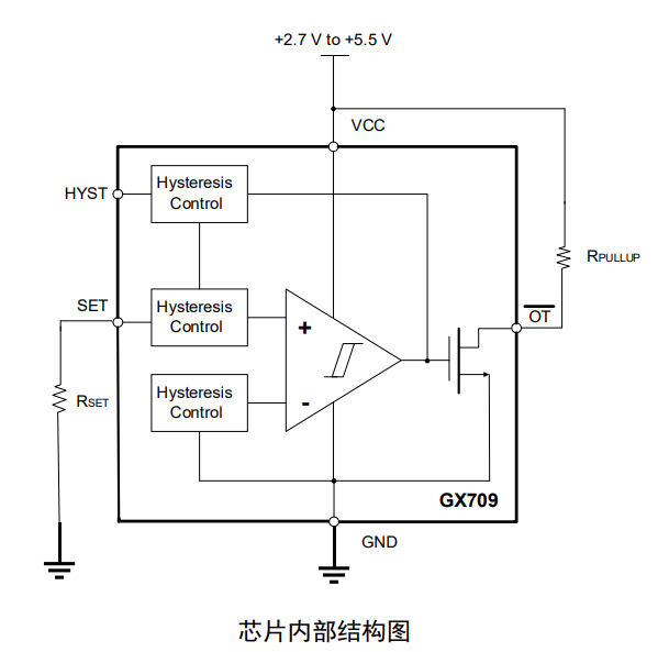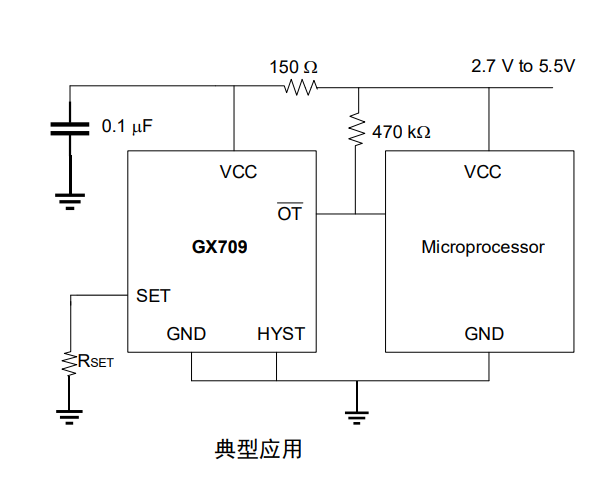 GX709是一款完全集成的、可编程电阻器温度开关,在其全工作范围内,只需一个外部电阻器即可设定温度阈值。GX709 提供一个开漏、低电平有效输出和一个介于2.7V至5.5V的电源电压范围。 温度阈值精度的典型值为±0.5℃而最大值为±3℃(+60℃至+100℃时)。静态流耗的典型值为 33μA。可通过引脚选择来确定 2℃或者 10℃的温度滞后。