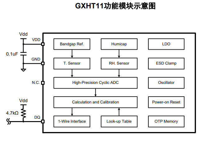 GXHT11是一款单片全集成的数字式温湿度传感器,内置电容式感湿单元和PN结感温单元,借助高精度ADC转换为数字输出。GXHT11在出厂前均已完成标定和校准,严格确保每颗芯片的一致性和精度。