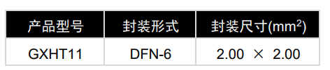 GXHT11采用小体积的DFN-6封装,外形尺寸极小,仅2.0mm x 2.0mm,高度0.75mm,可以应用在空间极度受限的场景中;采用单线接口,通信协议完全兼容DHT11,可以直接替换使用,无需修改客户现有方案。